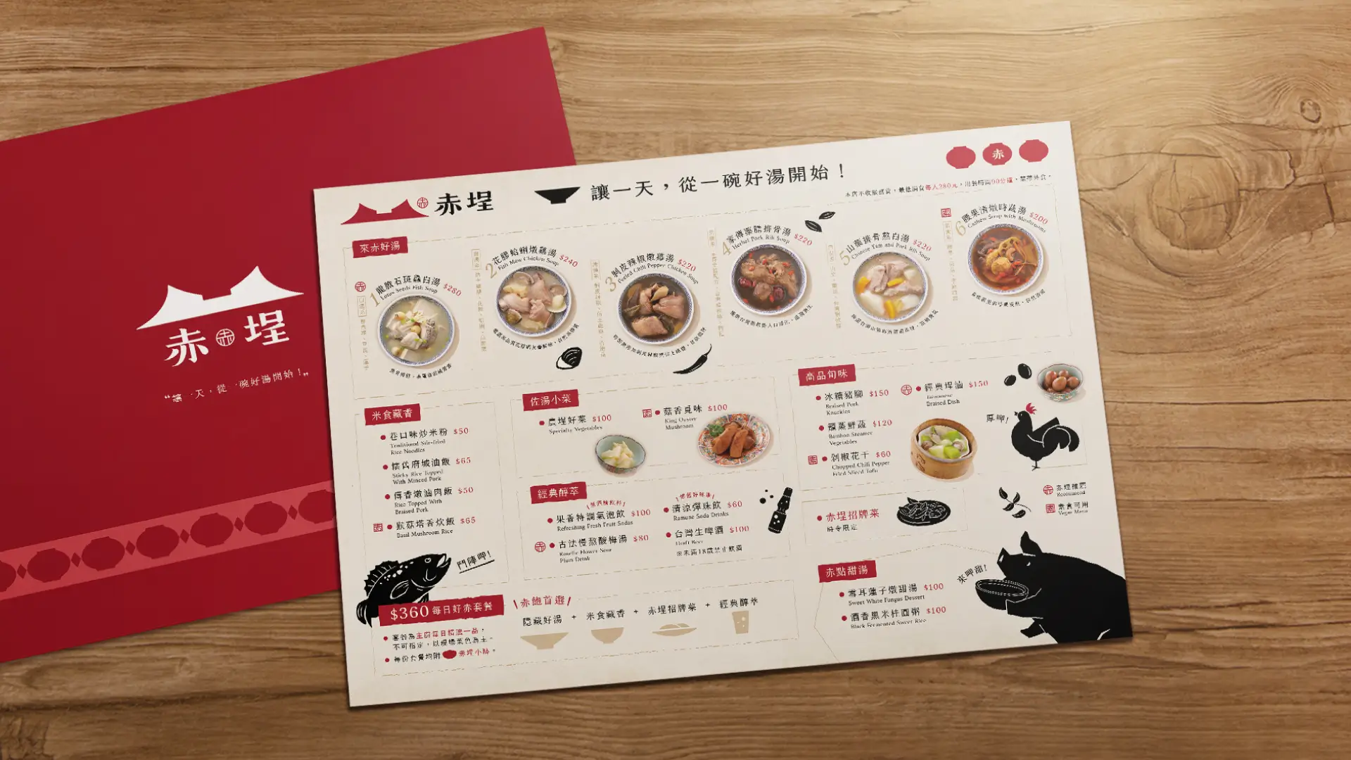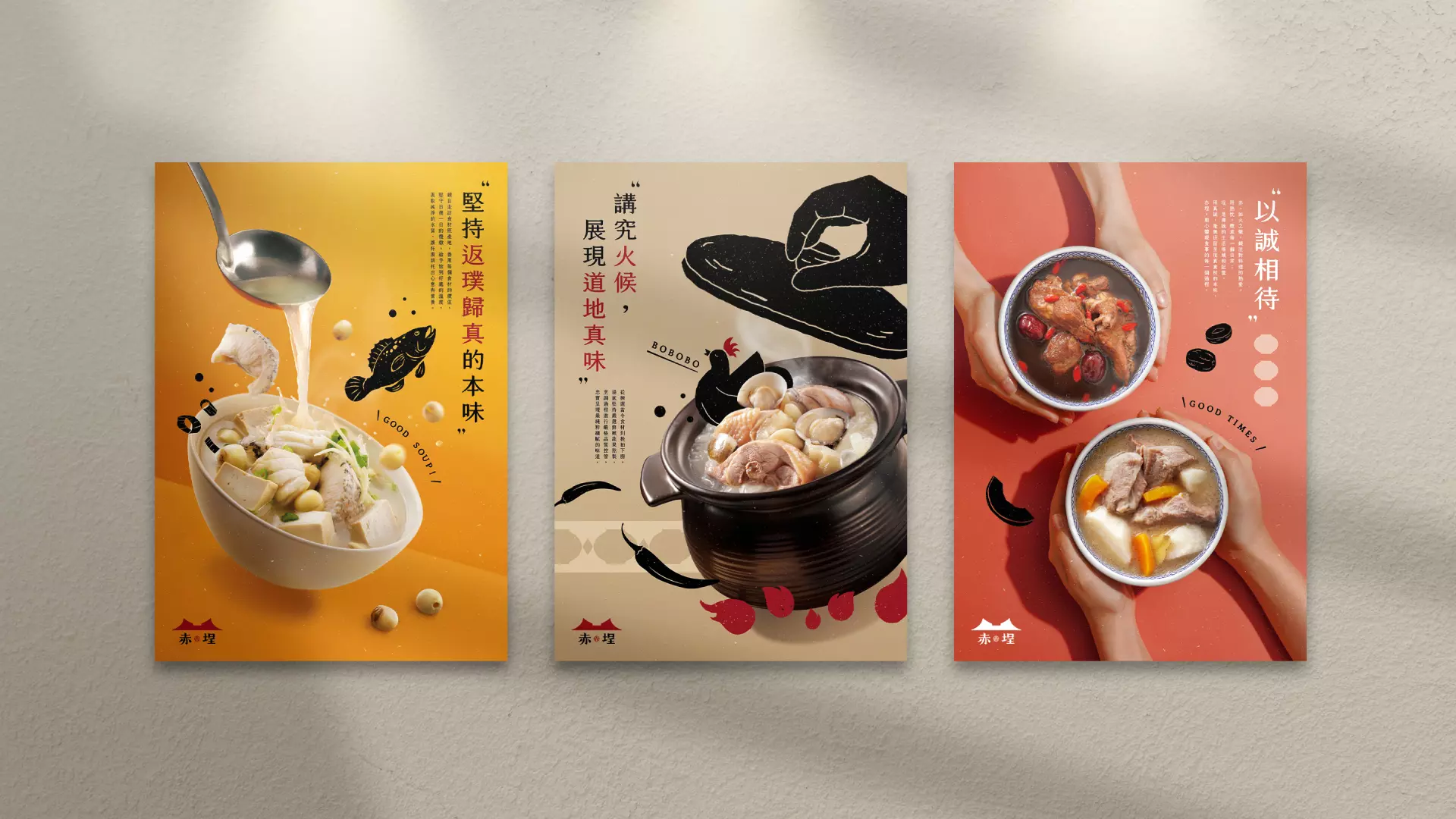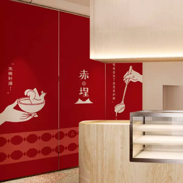 透過湯碗與古城的結合,呼應品牌名「赤埕」,如火之熾的熱情,喚醒每一個人內心的溫暖記憶,也同時象徵這碗湯使用原型食材燉煮,保留最純樸天然的好味道。