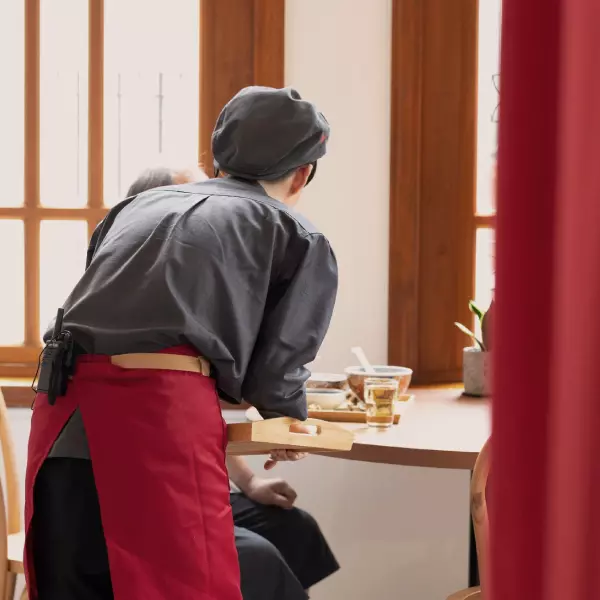 在店內服務人員的制服設計也充滿巧思,利用復古報童帽搭配品牌紅色圍裙,當服務人員穿梭在木質為主調的服務空間時,讓人彷彿回到60年代熱鬧的古城中。