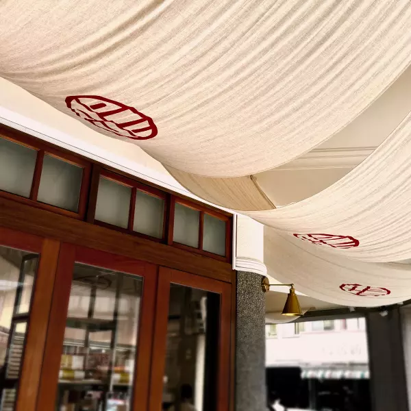 實體店面以大量帆布印刷裝潢,將品牌色完美融入大稻埕商圈古樸熱情的氛圍中,並將三張形象稿以畫作形式呈現於空間中,讓消費者在用餐的同時感受品牌對於商品的堅持,增強消費者對於品牌的印象。