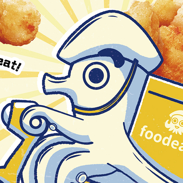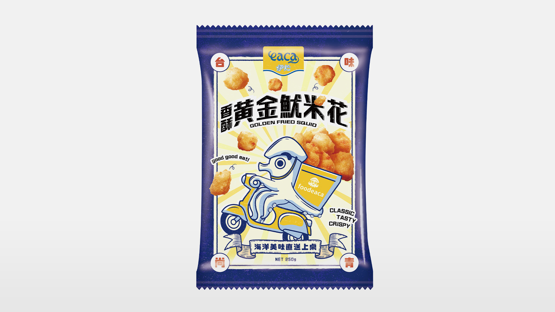 在思考包裝視覺如何呈現,我們發現到生鮮貨架上大多以美味的吃相圖為主,鮮少以活潑插畫方式溝通,如何讓商品在貨架上凸出,兼具好吃感是本次的課題。我們翻玩近年興起的外送品牌形象,變成「伊卡外送 foodeaca」放進包裝主視覺,創造話題。以大片藍色為底色,在貨架上獨樹一格,載著真實的魷米花呈現直送熱騰騰的好吃感,在家就可以吃到彷彿外送鹽酥雞攤的經典台味炸魷魚。